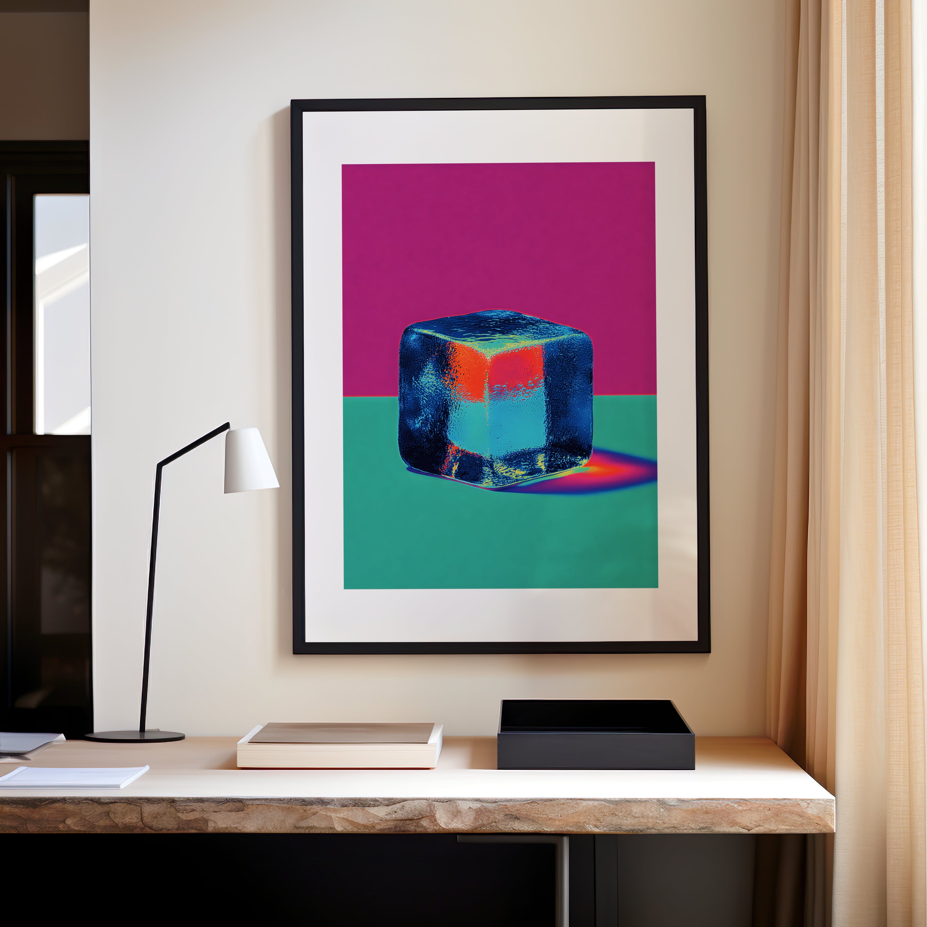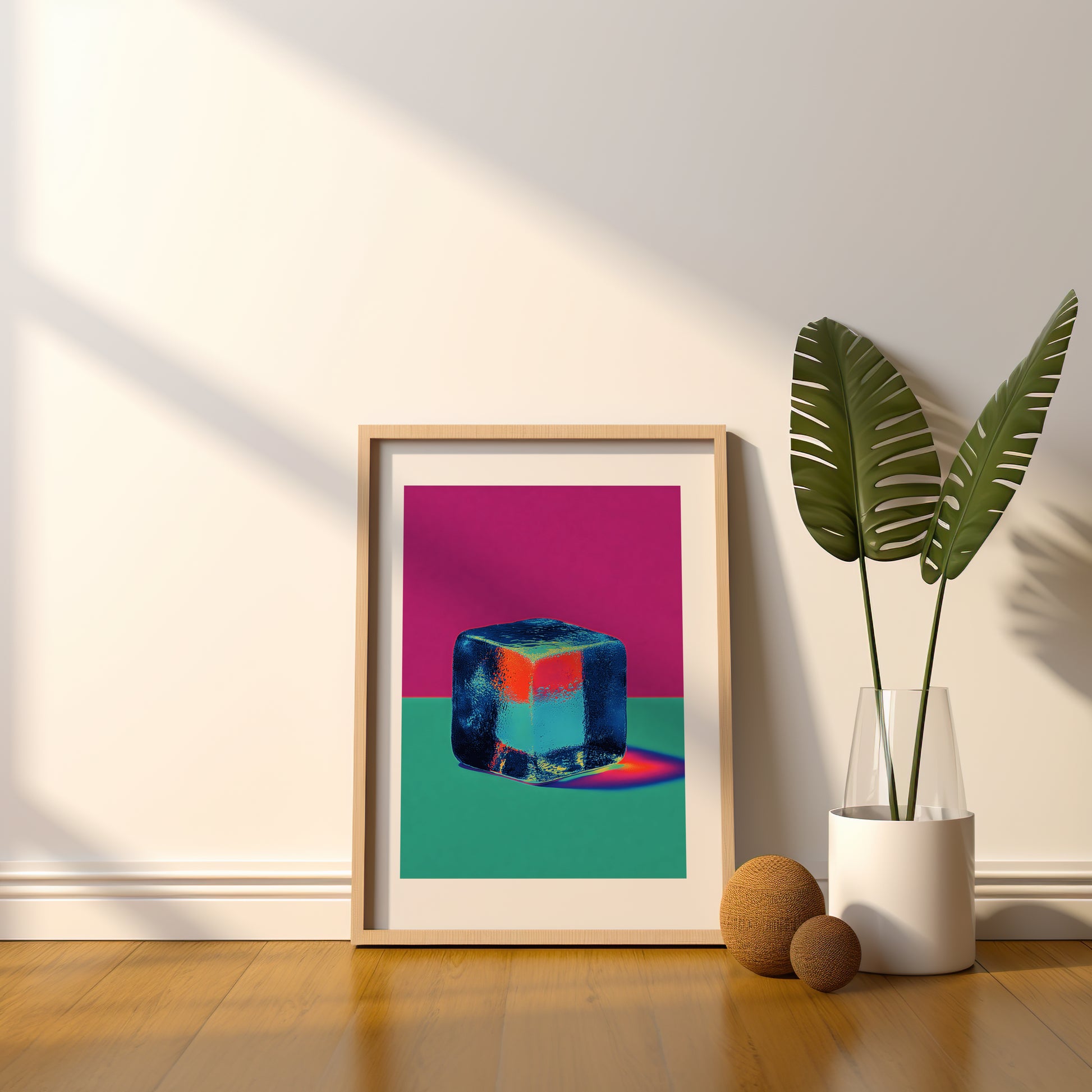 Cette œuvre d’art contemporaine colorée met en scène un cube de glace isolé sur un fond contrasté de vert et de rose.