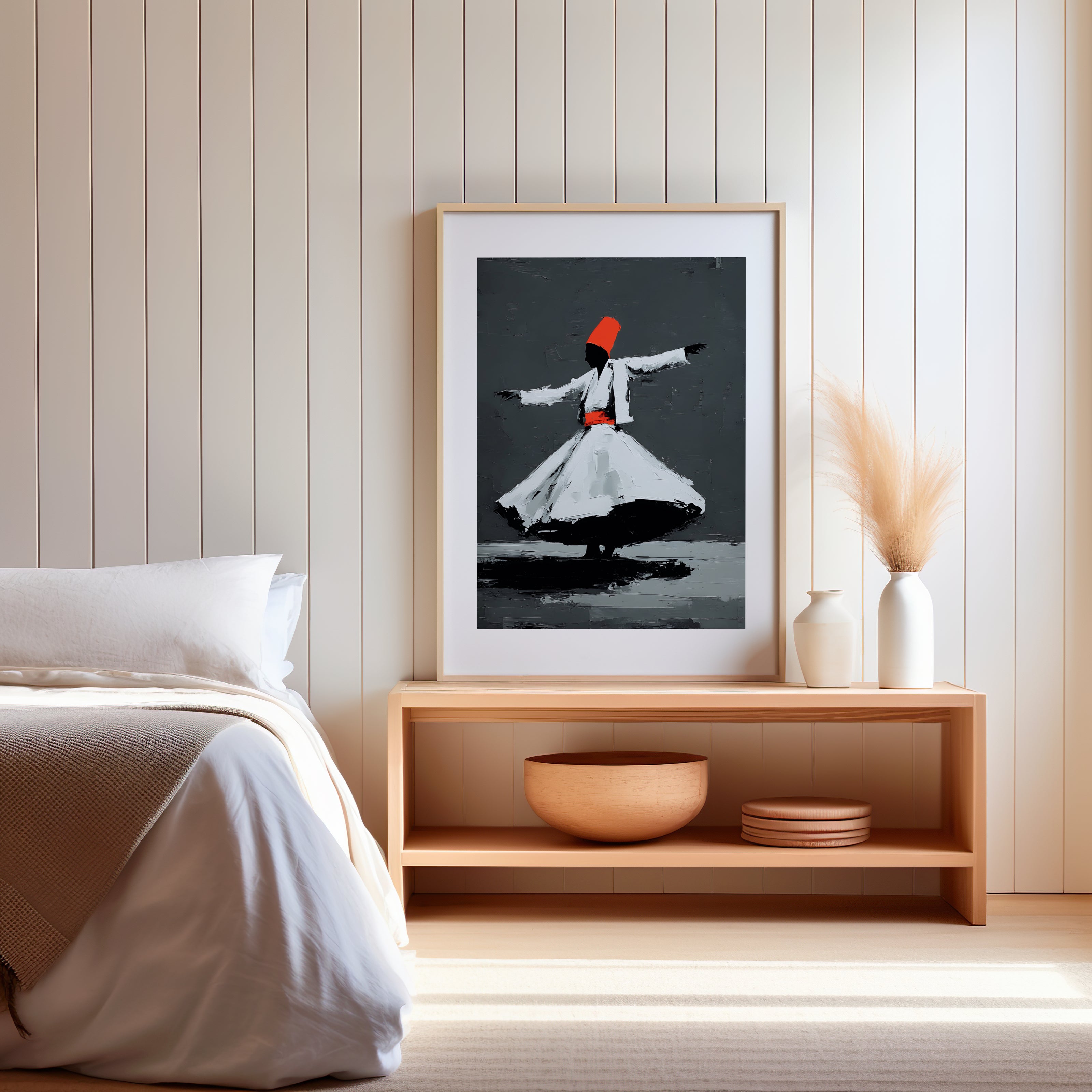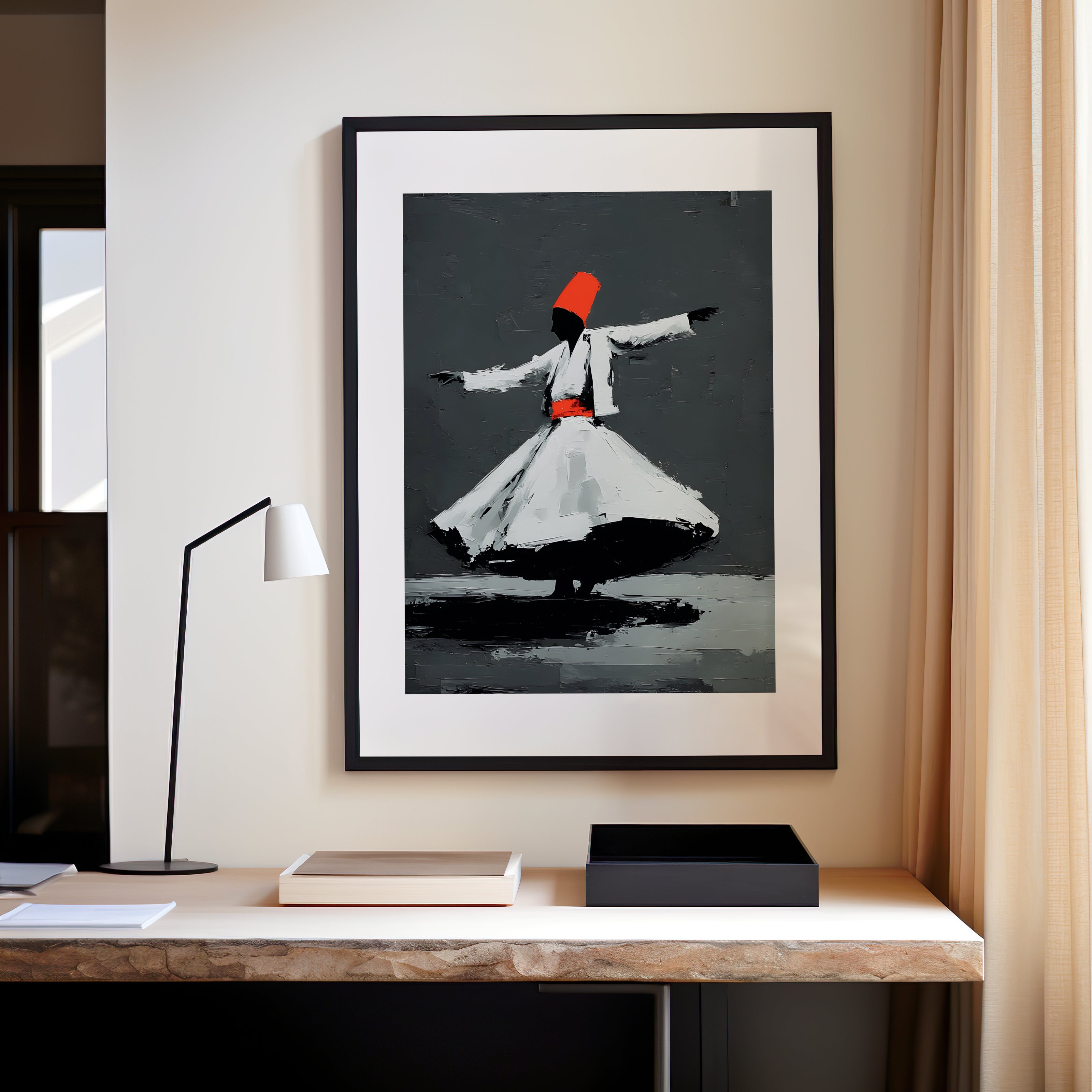 Cette œuvre d’art contemporaine représente un danseur soufi en rotation, capturé dans un mouvement suspendu.