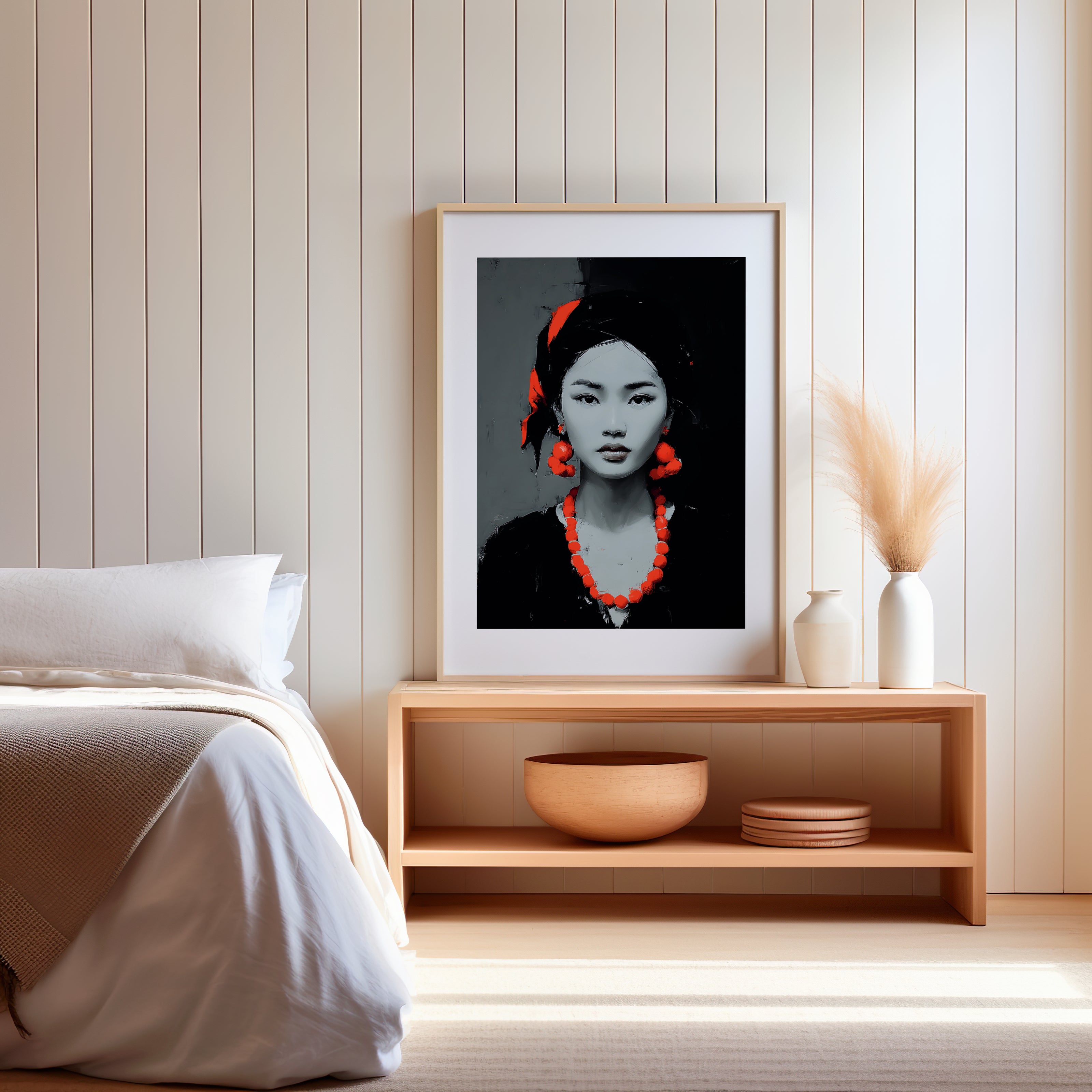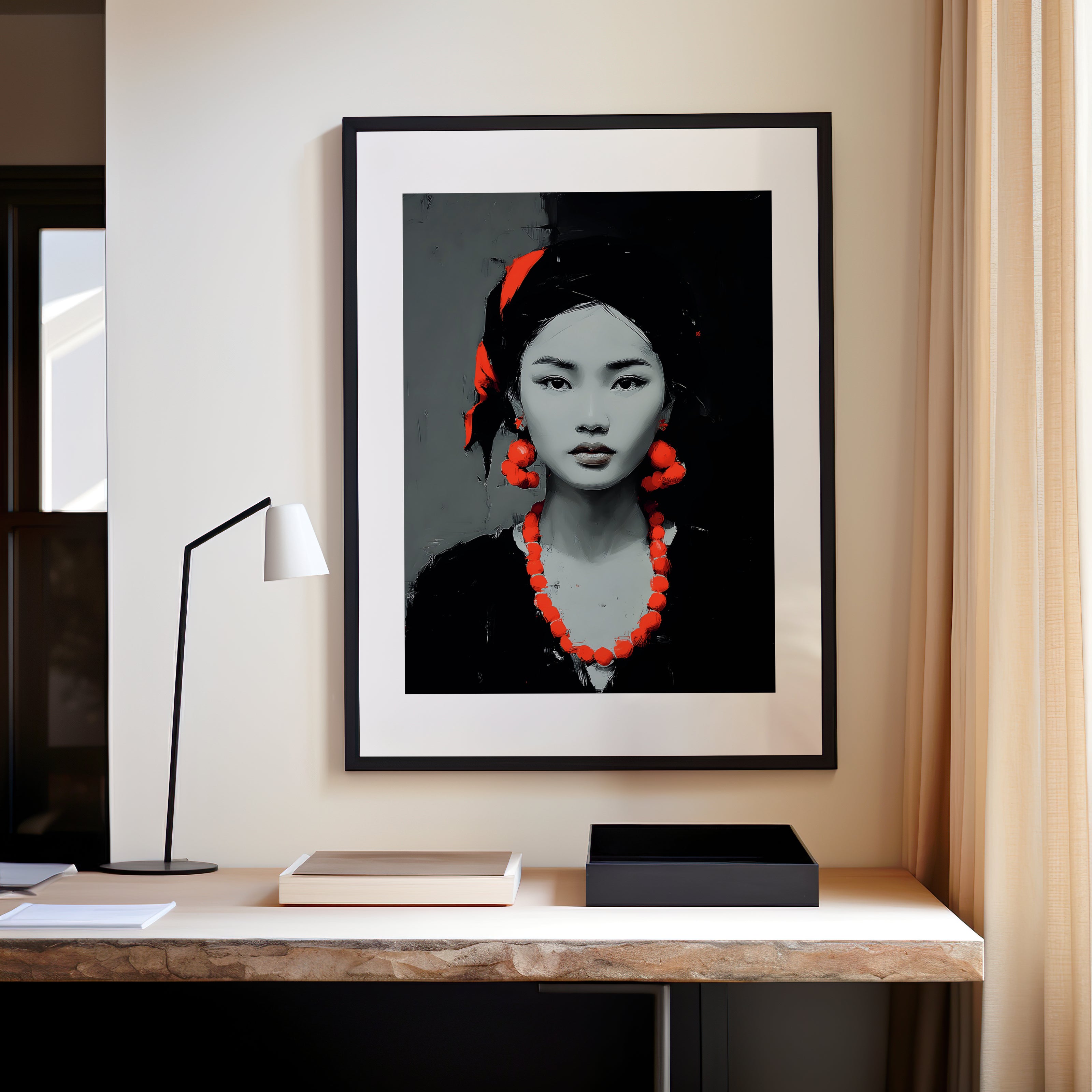 Cette œuvre contemporaine présente un portrait de femme au contraste entre le noir, le blanc et le rouge éclatant.