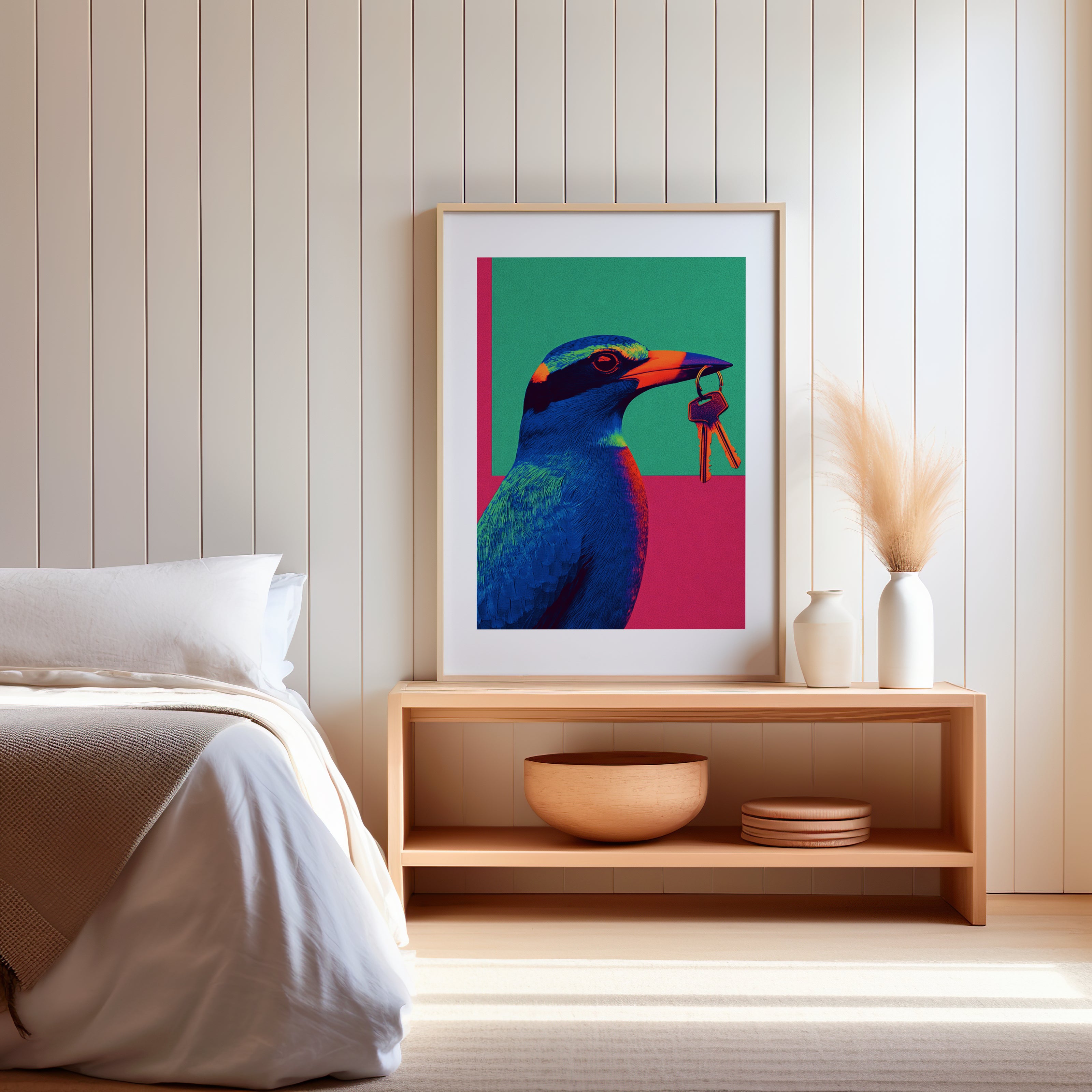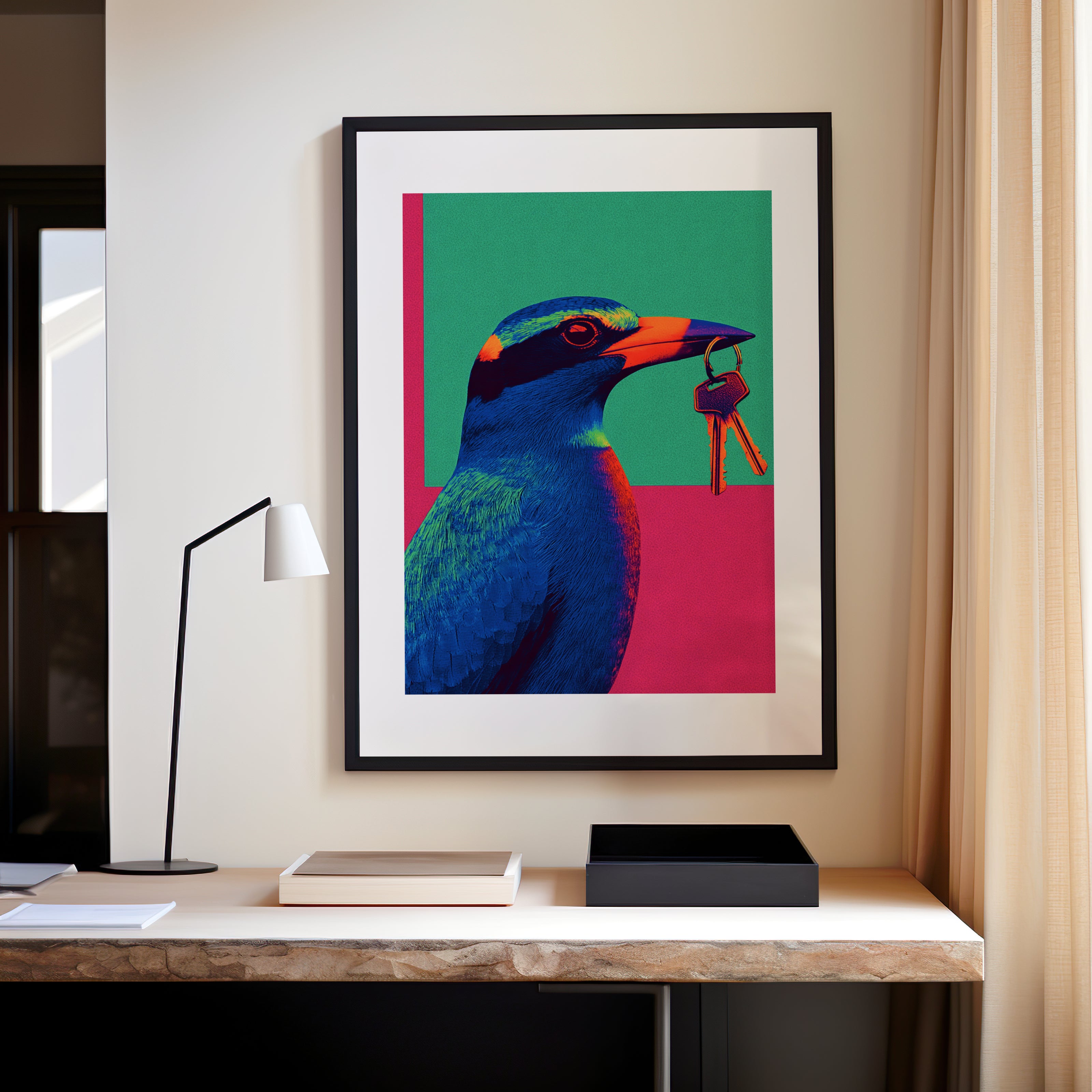 La silhouette bleutée et les clés suspendues au bec forment un point focal singulier.